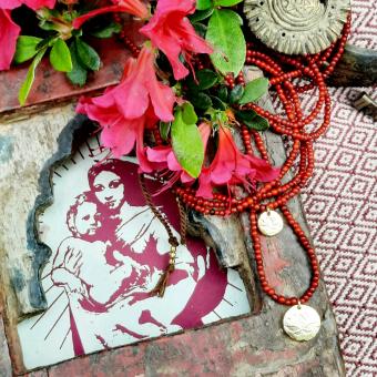 These necklaces are handmade by the craftswomen from Beads for Life (Nepal). They are made with re-used glass beads from jewellery originally worn by Bonda women. The Bonda tribes live in the hills of Odisha, India. The women only wear a loincloth. Their torsos and heads are covered in strings of colourful beads.