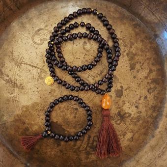 The mala is made from 108 sandal wood beads, 3 rose quartz marker beads and a oval faceted moonstone. Rose quartz is associated with unconditional love and compassion. Moonstone restores emotional stability. A small gold plated pendant with the tree of life and a luxurious cotton tassel are attached to the mala.