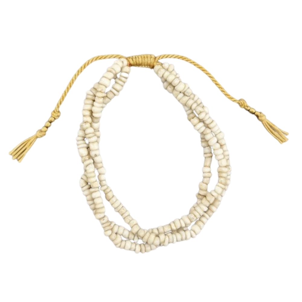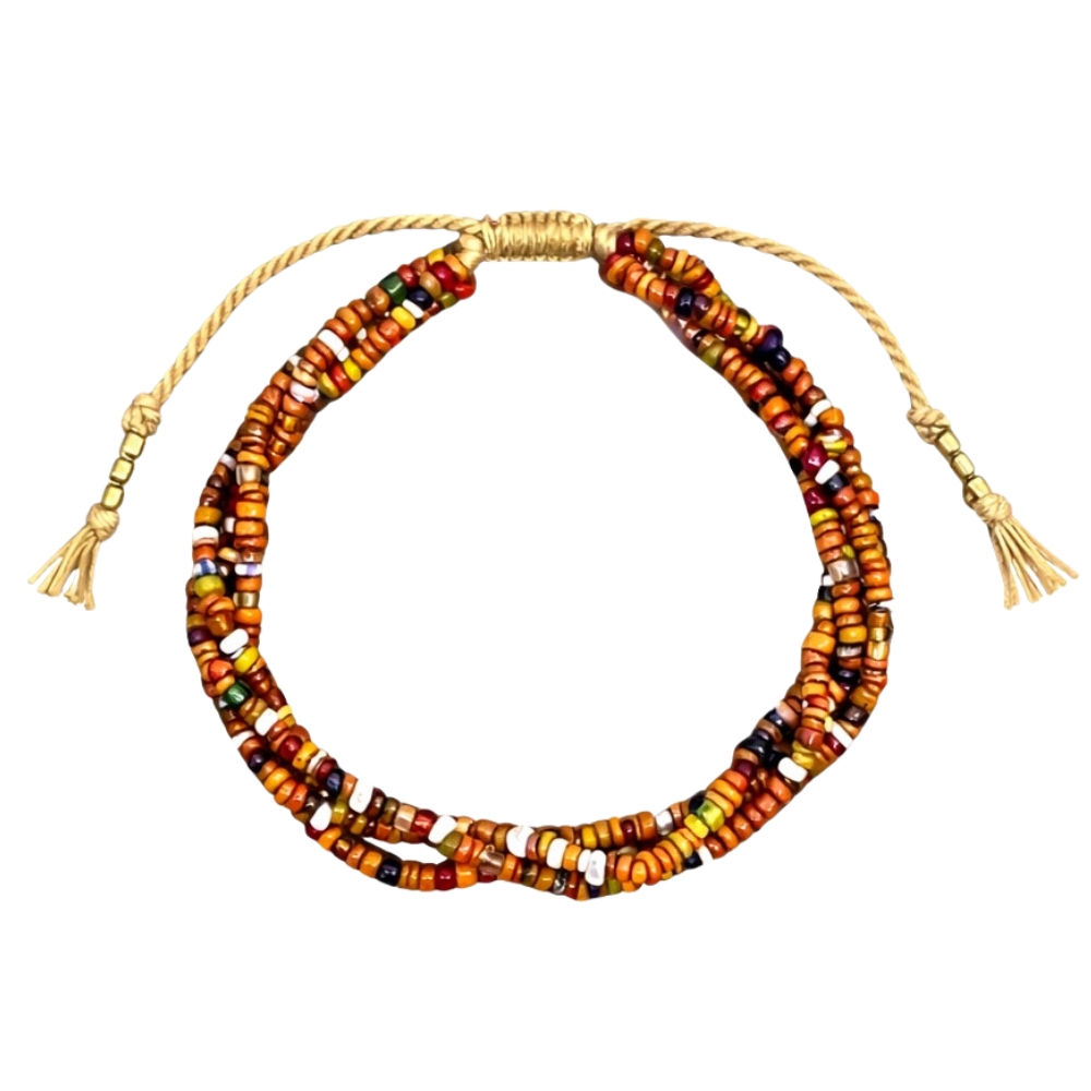 Bekwame vakvrouwen uit Nepal maakten deze armband met de hand. Ze zijn samengesteld uit hergebruikte glaskralen van kettingen die oorspronkelijk werden gedragen door Bonda-vrouwen uit Odisha, India. Zij bedekken hun lichaam met vele strengen glaskralen. De oude kralen werden tientallen jaren gedragen door Bonda-vrouwen. Het Bonda-volk leeft in de heuvels van Odisha (India). Bonda-vrouwen dragen alleen een lendendoek, ze bedekken hun lichaam en hoofd met kleurrijke strengen kralen.