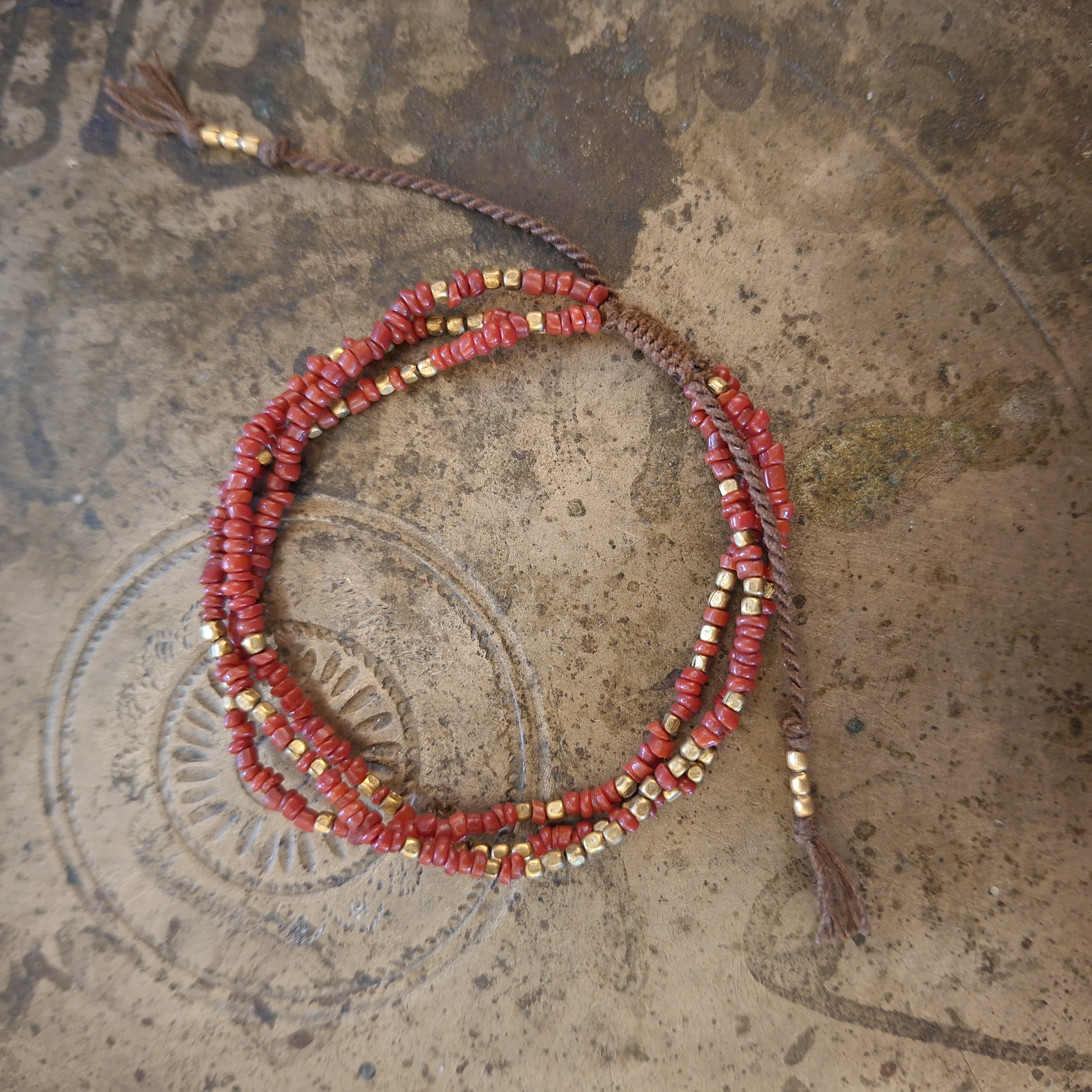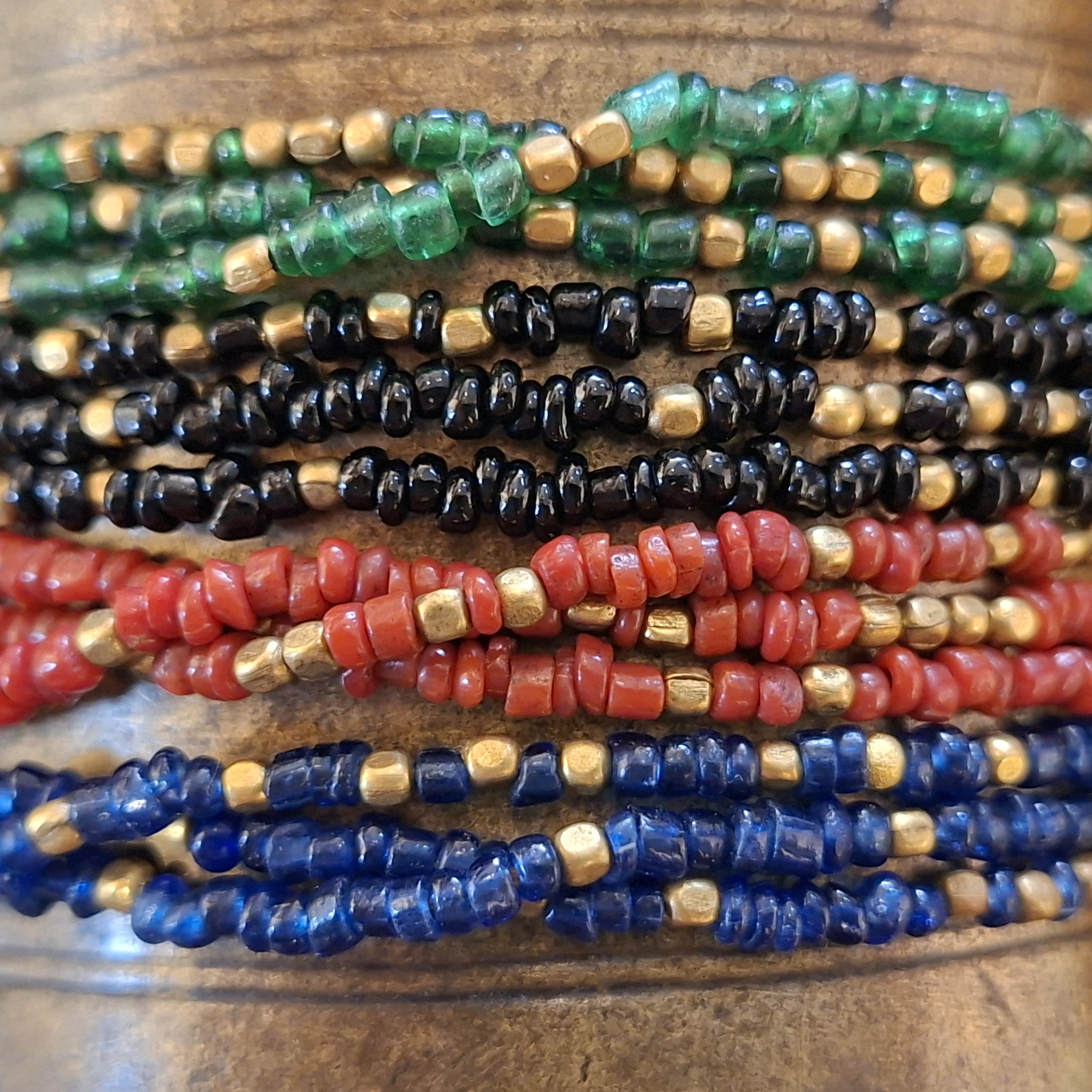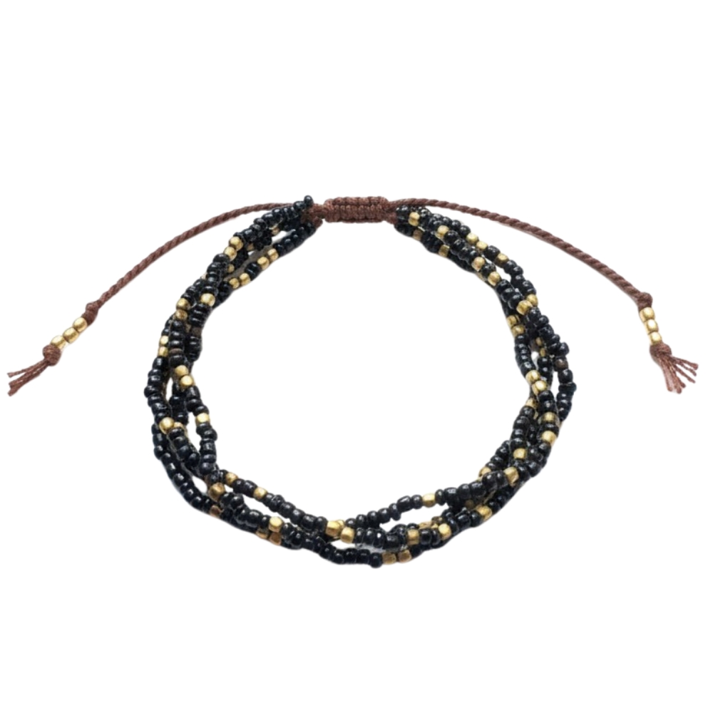Bekwame vakvrouwen uit Nepal maakten deze armband met de hand. Ze zijn gemaakt van gekleurde glaskraaltjes en bronzen kraaltjes. Met de geknoopte schuifsluiting passen de armbanden om bijna iedere pols.  Ze zijn 16 - 22 cm lang.