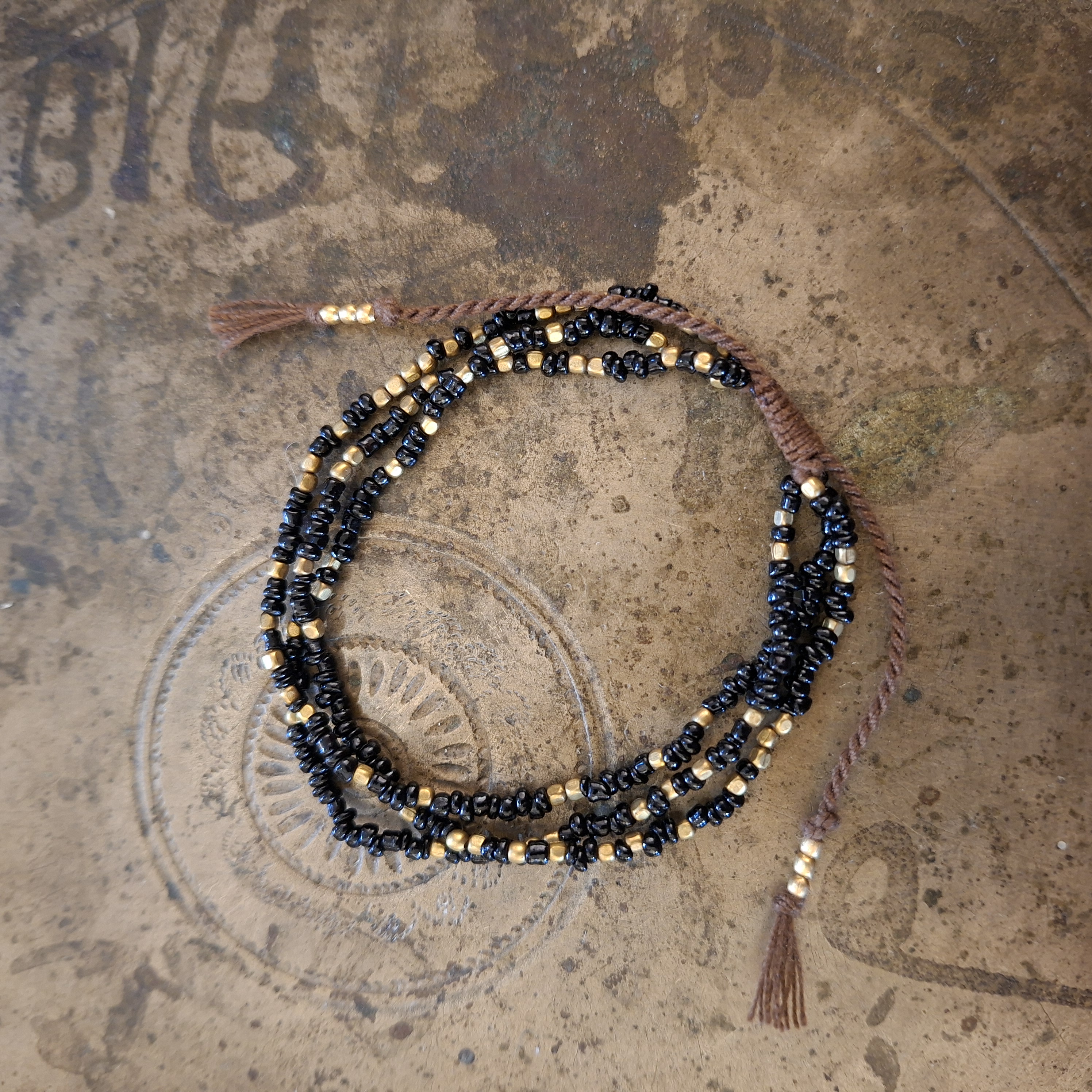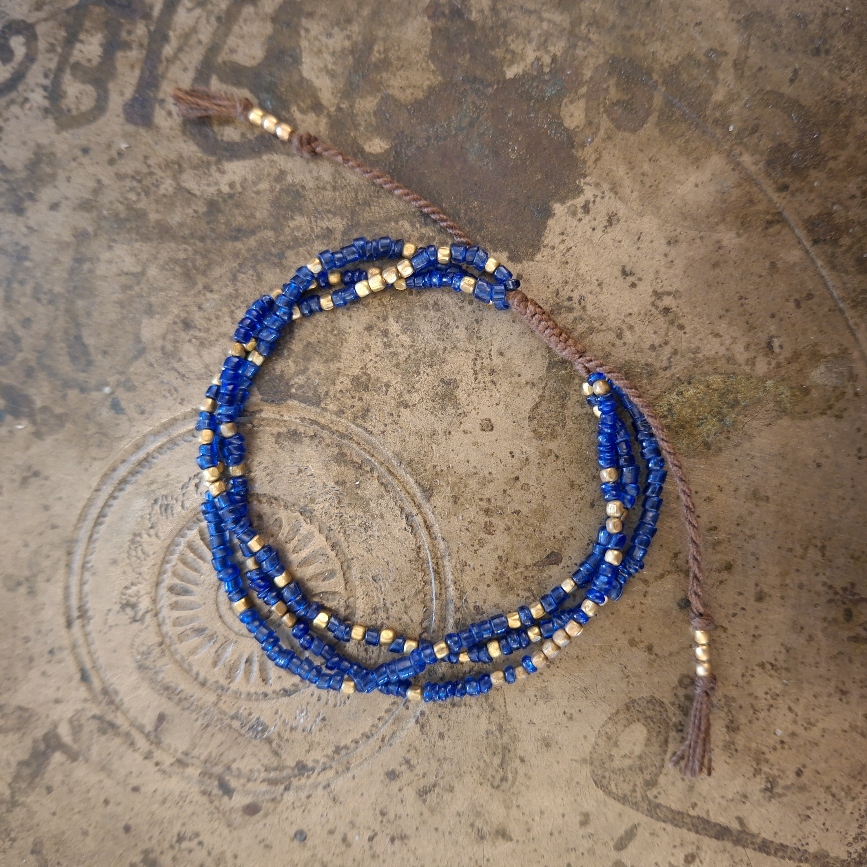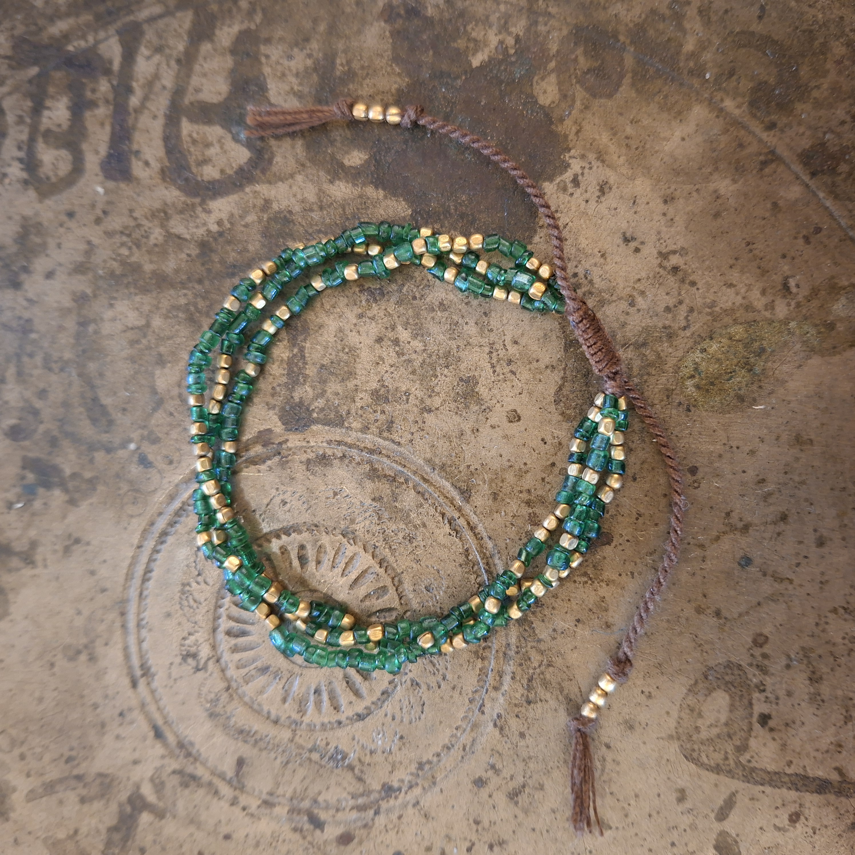 Bekwame vakvrouwen uit Nepal maakten deze armband met de hand. Ze zijn gemaakt van gekleurde glaskraaltjes en bronzen kraaltjes. Met de geknoopte schuifsluiting passen de armbanden om bijna iedere pols.  Ze zijn 16 - 22 cm lang.