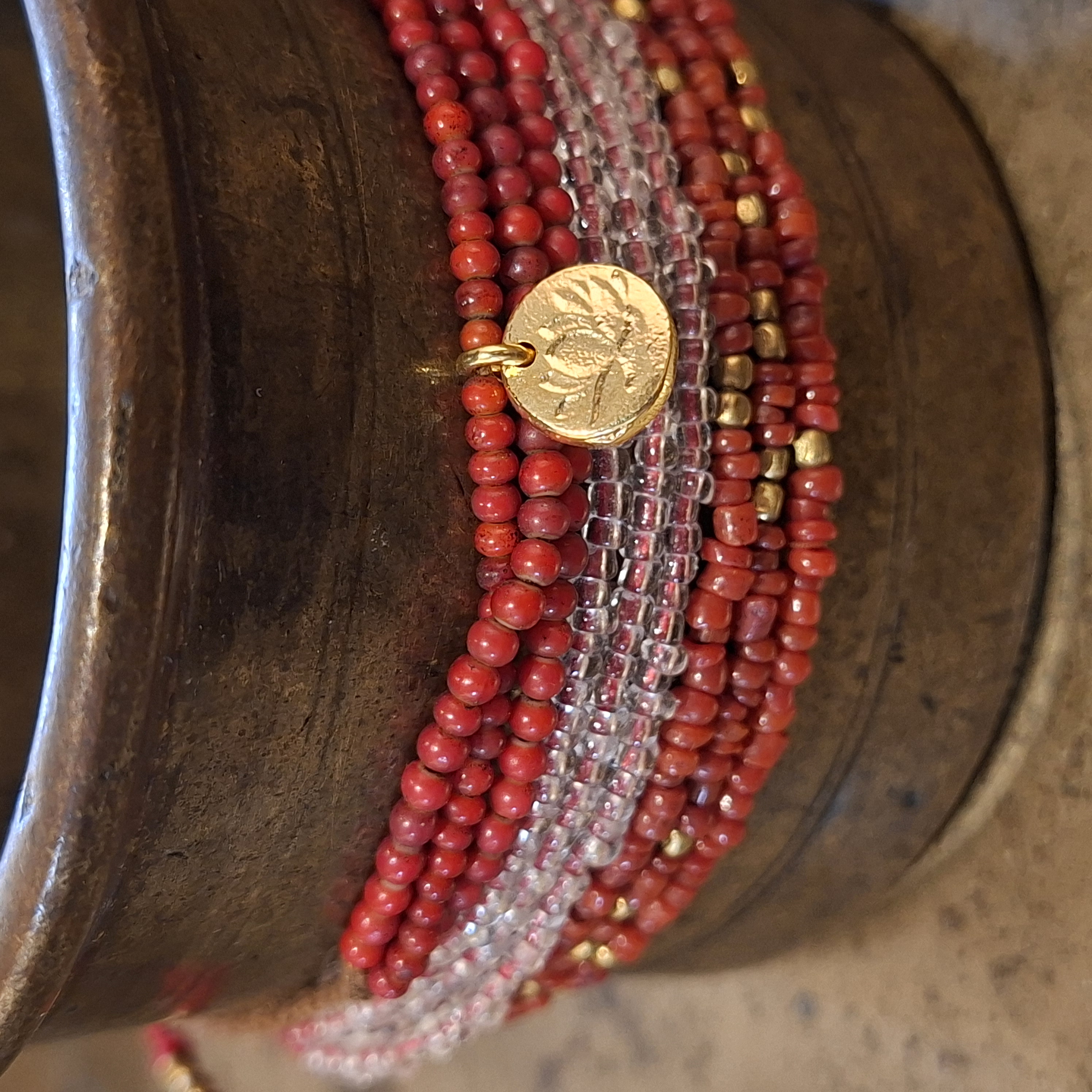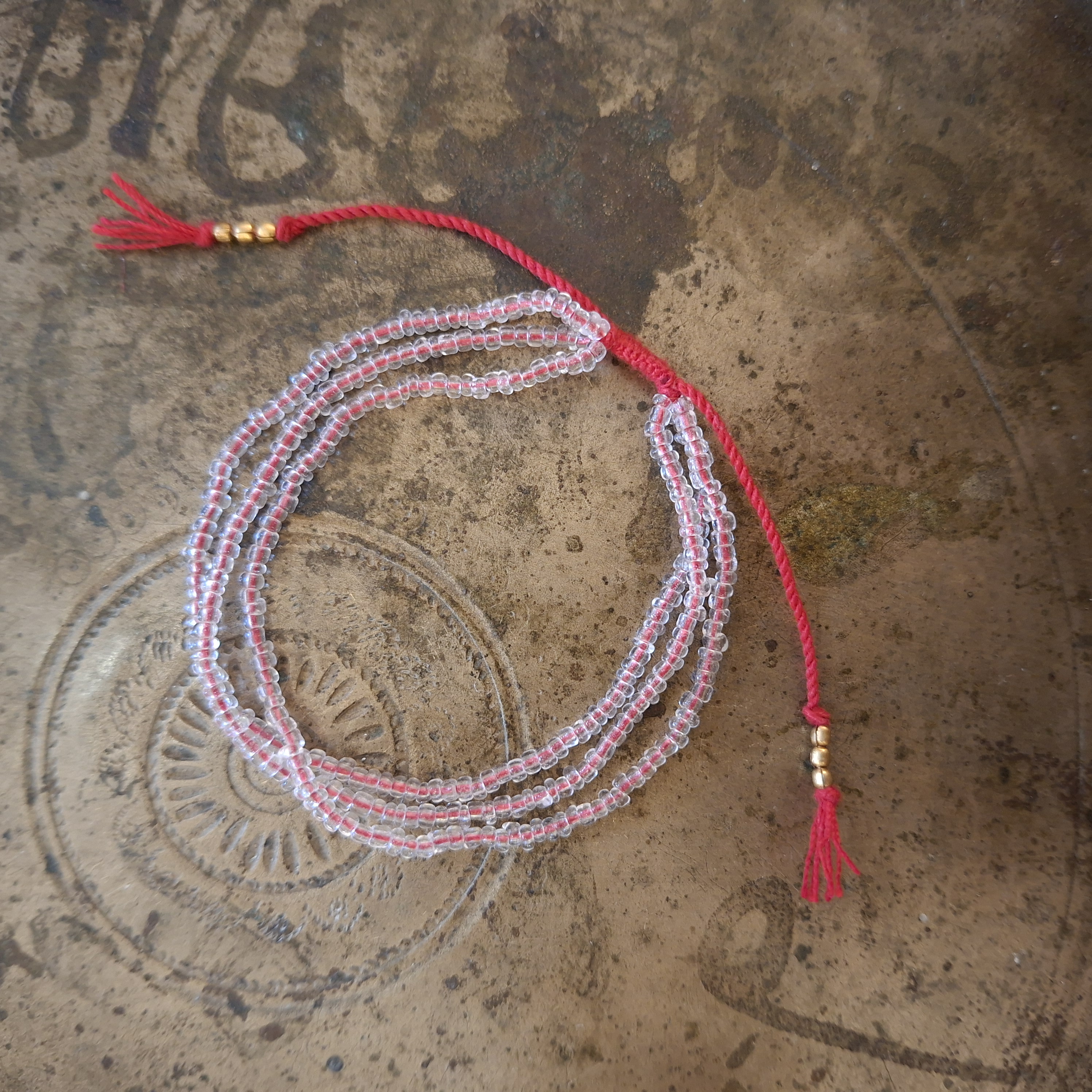 Bekwame vakvrouwen uit Nepal maakten deze armband met de hand. Ze zijn gemaakt van kristal-kleurige glaskraaltjes en contrasterend rood katoen. Met de geknoopte schuifsluiting passen de armbanden om bijna iedere pols (16 - 22 cm).