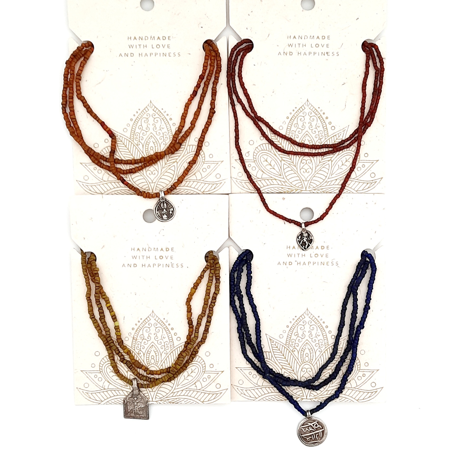 De vakvrouwen van Beads for Life (Nepal) maken deze kettingen met de hand. Ze zijn samengesteld uit hergebruikte glaskralen van sieraden die tientallen jaren werden gedragen door Bonda-vrouwen uit Odisha, India. Het Bonda-volk leeft in de heuvels van Odisha (India). Bonda-vrouwen dragen alleen een lendendoek, ze bedekken hun lichaam en hoofd met kleurrijke strengen kralen.