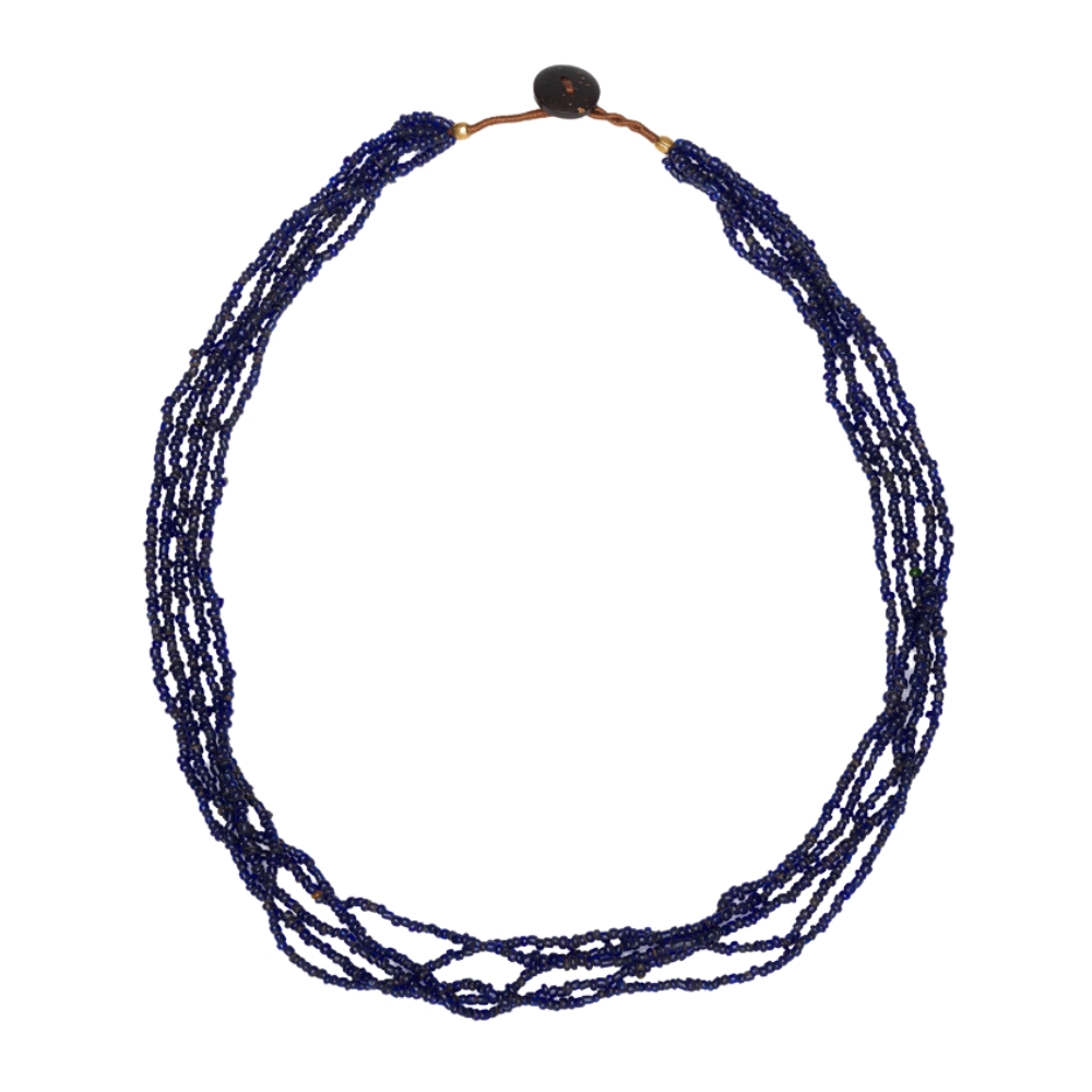Bekwame vakvrouwen uit Nepal maakten deze colliers met de hand. Ze zijn samengesteld uit hergebruikte glaskralen van kettingen die oorspronkelijk werden gedragen door Bonda-vrouwen uit Odisha, India. Zij bedekken hun lichaam met vele strengen glaskralen.