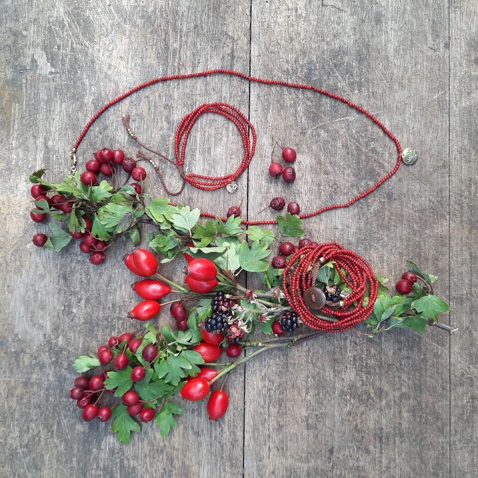 De kraaltjes in dit collier worden  ‘white hearts’ genoemd. De glaskralen hebben een witte kern, daaromheen zit een laagje rood glas. Door deze eeuwenoude techniek ontstaan fijne kleurnuances.