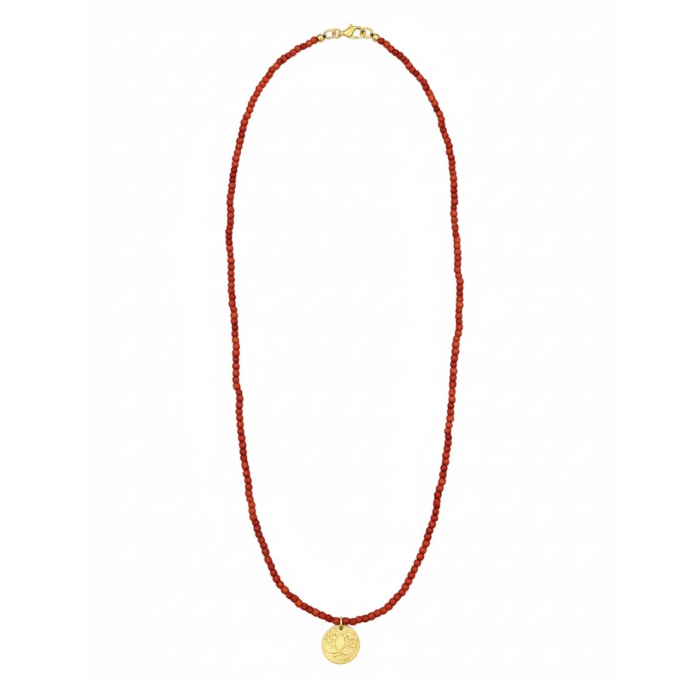 Aan het collier hangt een verguld bedeltje met een lotus. De lotus symboliseert zuiverheid en verlichting. Net zoals de lotus uit modderig water groeit naar het licht, moedigt het ons aan naar schoonheid en goedheid onder de oppervlakte te zoeken en te streven naar ons hoogste potentieel.