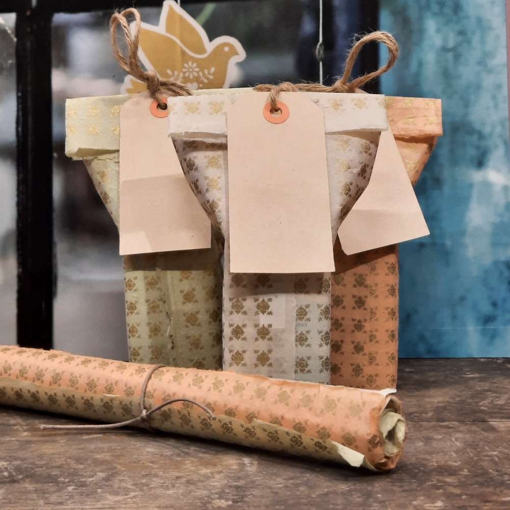 Stevig cadeaupapier, handgeschept. De randjes van het papier zijn niet schoongesneden, de randen van het schepraam zijn daarom zichtbaar in het papier.