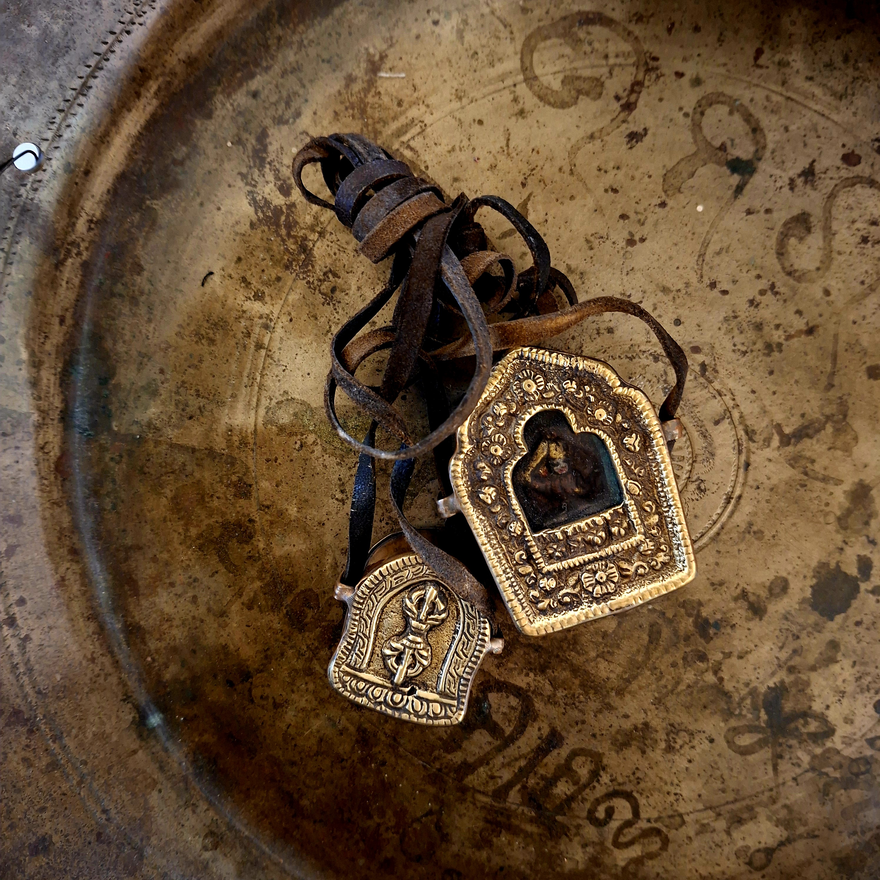 Koperen amulethouder met ruitje. Achter het ruitje is een klein beeldje van klei zichtbaar en een stukje stof van een Tibetaans gebedsvlaggetje. De houder hangt aan een leren koordje. De amulethouder kan aan de achterzijde voorzichtig geopend worden zodat je er je eigen amulet in kan plaatsen. De amulethouders zijn gemaakt door de Newar uit het Boeddhistische Patan, een prachtige middeleeuwse stad ten zuiden van Kathmandu, Nepal. De Newar staan bekend als kundige ambachtslieden die sinds eeuwen bijdragen aan het rijke artistieke erfgoed van Nepal.