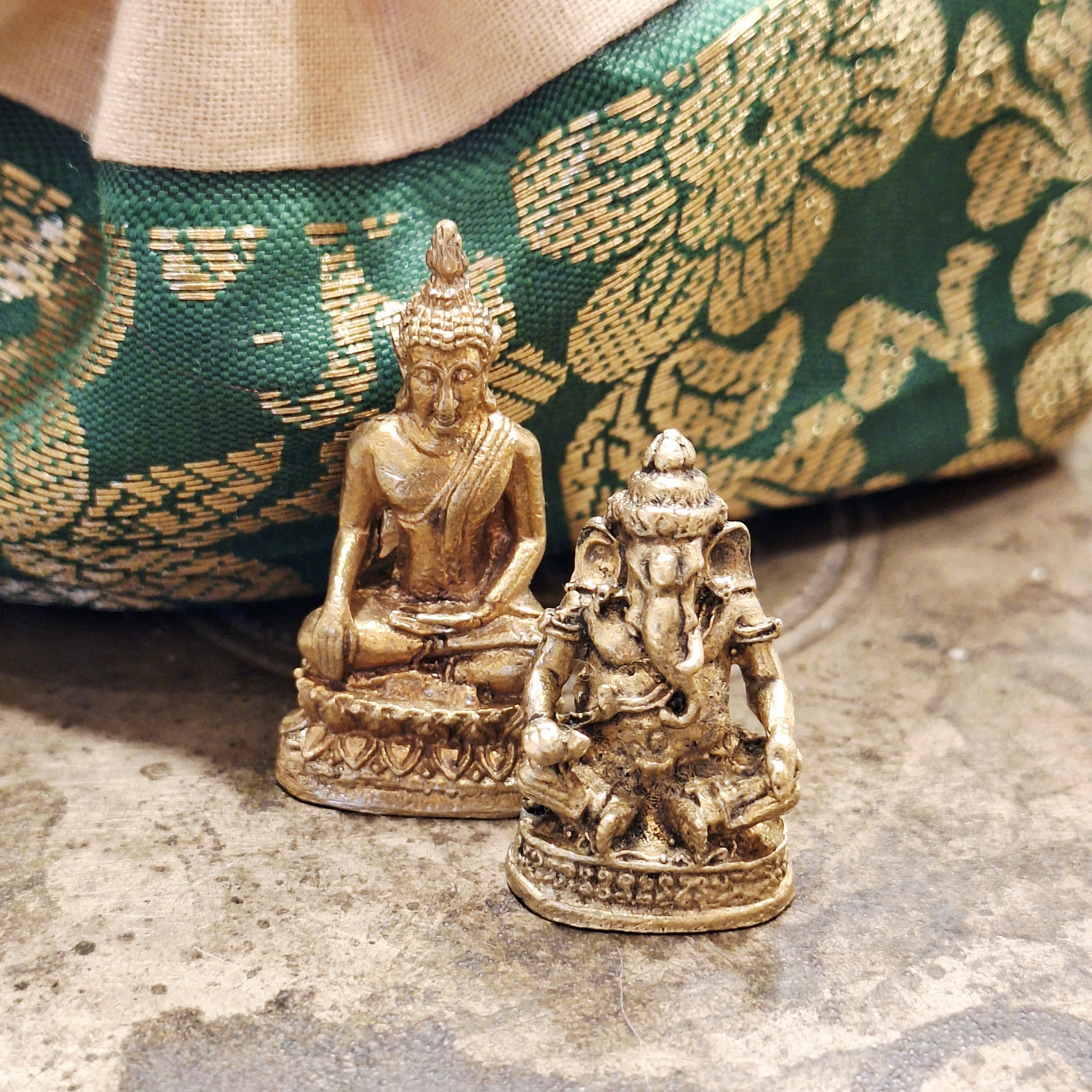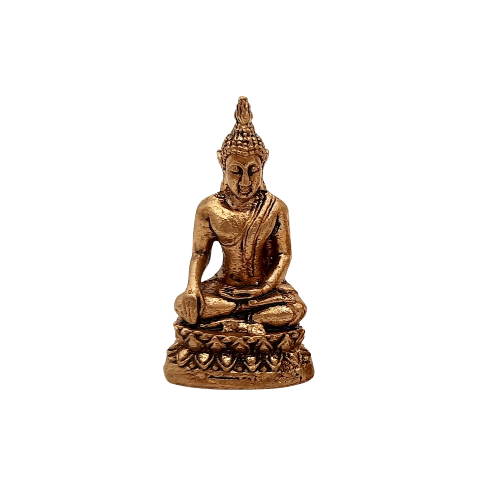 Dit kleine (reis)beeldje van Boeddha Sakyamuni, in meditatiehouding gezeten op een lotus, verbeeld de wijsheid en rust van de historische boeddha. Siddhartha Gautama, ook bekend als de wijze van de Sakya's, kreeg deze titel na het bereiken van de verlichting. De houding van de rechterhand, rustend op de rechterknie en met de vingertoppen de aarde aanrakend heet bhumisparsha-mudra. Het symboliseert het moment van verlichting. Het beeldje is gemaakt in Nepal van gerecyclede metalen.