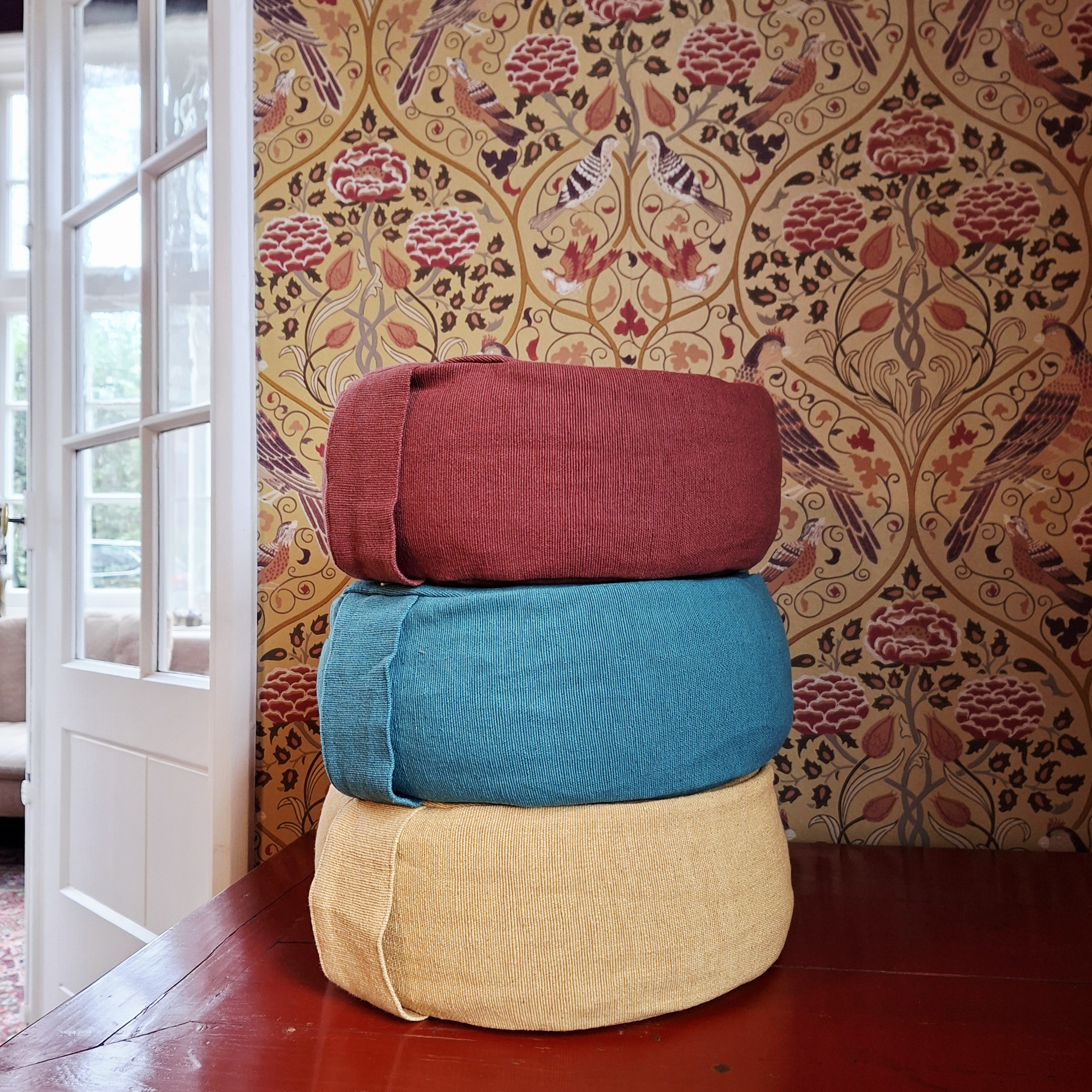Onze yoga poefjes worden gemaakt van handgeweven stoffen. In een weef-atelier wordt katoen met de hand gesponnen tot dikke draden. Deze draden worden gebruikt om stoffen te weven in de mooiste patronen. Het naaiatelier gebruikt deze stoffen om de yoga poefjes te stikken. In Nederland worden de poefjes in een re-integratie werkplaats gevuld met boekweitdoppen.