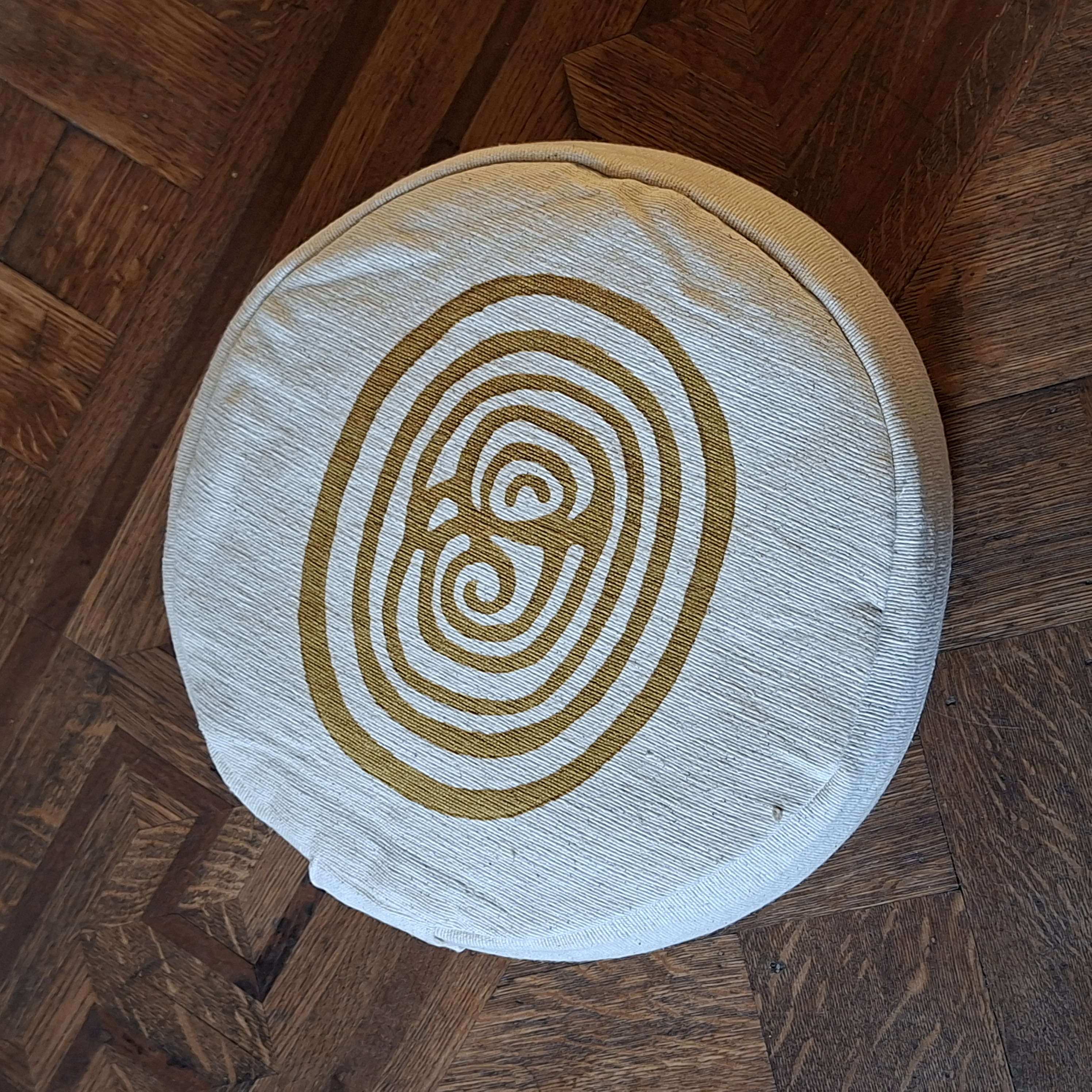 Yoga, meditatie of een extra poefje in je woonkamer. Dit kussen is er klaar voor. Het is fairtrade gemaakt in Nepal van met de hand gesponnen én geweven katoen. Het kussen is versierd met een afbeelding van een oud labyrinth, het symboliseert de reis naar binnen en weer terug, zelfreflectie en transformatie. De afbeelding is met een blokdruk aangebracht. Met de stevige greep draag je het kussen gemakkelijk met je mee.